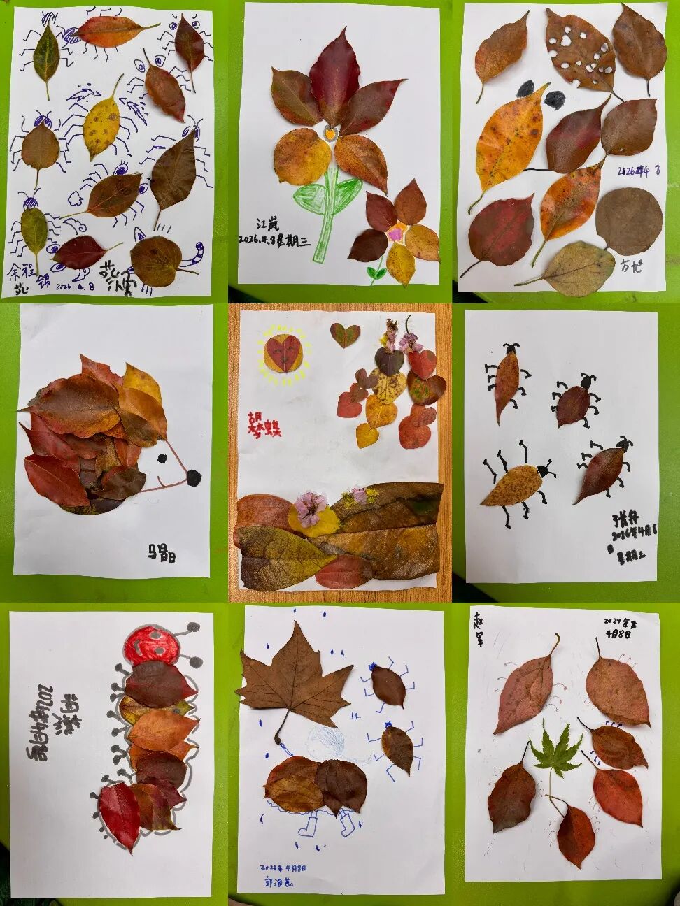 有人用圆圆的叶片拼出刺猬满身的刺,再添上小巧的鼻子和眼睛,那刺猬仿佛下一秒就要在纸上打个滚;有人把一片片椭圆叶串联起来,变出一条胖乎乎的毛毛虫,憨态可掬;还有人用不同颜色的叶子层层叠加,铺出一幅绚丽的风景画——远山近树,意境悠然。