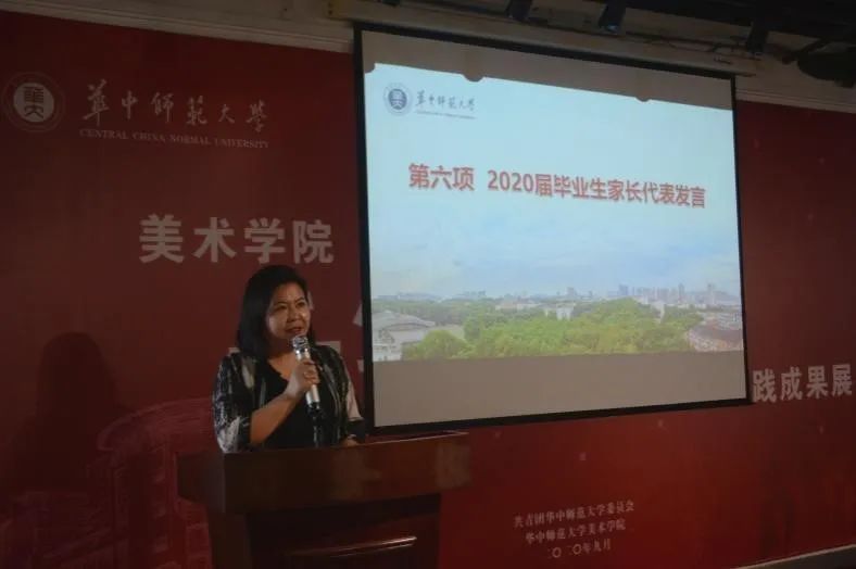 紧接着,由2020届毕业生李佳蔚家长和新生家长代表进行发言。“过去的4年,我和孩子共同成长,见证了华师忠诚博雅、朴实刚毅的教学理念,和老师们辛勤育人的行囊。我的孩子在这里度过了愉快而勤奋的4年,取得了满意的成绩。”家长代表说道。作为一名毕业生的家长,李佳蔚家长还向新生家长们分享了自己的经验,她认为第一步就是要学会放手,让孩子自由的飞翔,并且要时刻关注孩子的心理问题,家长们应和孩子平等的交流。美院以自由开放的学术氛围,给予学生们全面发展的平台,所以家长一定要相信孩子们的无限可能性,鼓励他们多尝试,冲出舒适圈。新生家长代表戴依宁妈妈和李佳禧妈妈则对华中师范大学美术学院给予了充分的肯定。她们表示,华中师范大学有着深厚的文化底蕴,有着雄厚的师资力量。在这里不仅是知识的殿堂,更是梦想的天堂。作为学生的家长未来将全力支持配合学校的教学管理工作,共同为孩子的学业和学校的发展贡献自己的力量。