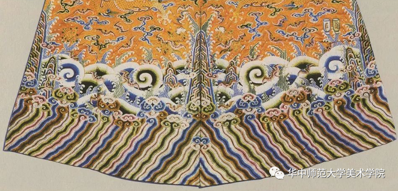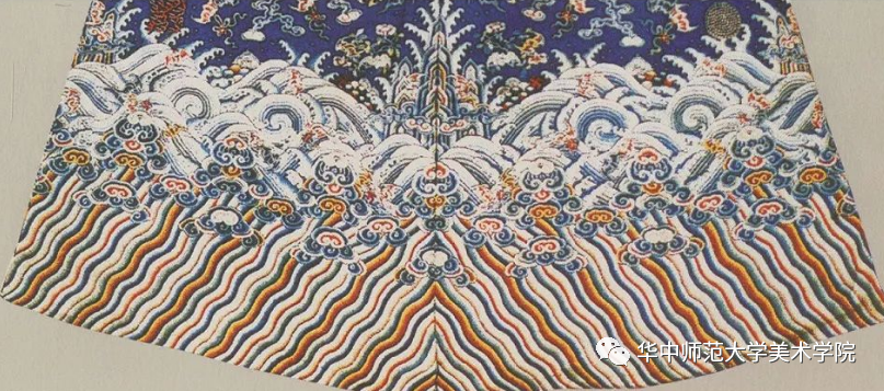 清代早期海水江崖纹还保留着明代遗风,而后逐渐演变出独特的风格,出现了平水纹与立水续的划分,平水纹是指水波图案,即螺旋状卷曲的横向曲线,以多层重叠的曲线来模仿海波、海浪、漩涡等;立水纹是指山崖下方的斜向排列的波浪线,俗称“水脚”。