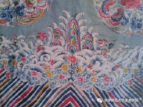 晚清时期,水纹图形,立水斜线,越益简单,退晕层次渐少,立水图形所占的面积越来越多,几乎占整个袍服的三分之一。水位越高,水势越小。清朝文武官补服所饰的珍禽、猛兽形象是等级标志,从一品到九品,每一品补服的云、水纹图形都有变化,多姿多彩,极具创意。