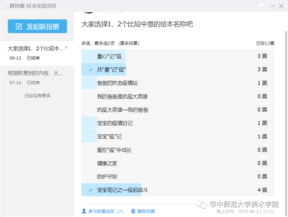 8月12日至13日,实践队队员在QQ群内完成了关于绘本名称选择的投票,从队员们集思广益的众多绘本名称里,选定《“宝宝笔记之‘疫’起战斗”》作为绘本名称,绘画组队员为绘本设计出封面。