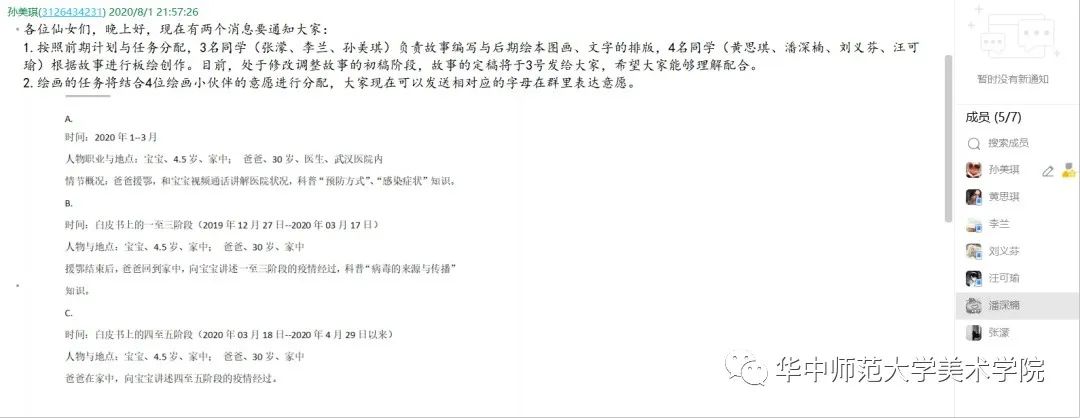 实践初期,“童心战疫”实践队所有成员在QQ线上平台召开会议,进行了工作任务的分配,成员们分别负责攥写故事情节并排版绘画与文字和IP人物形象设计与板绘设计,在对每一位成员的提案进行比较后,经过投票选出了最受欢迎的一份提案进行深化。