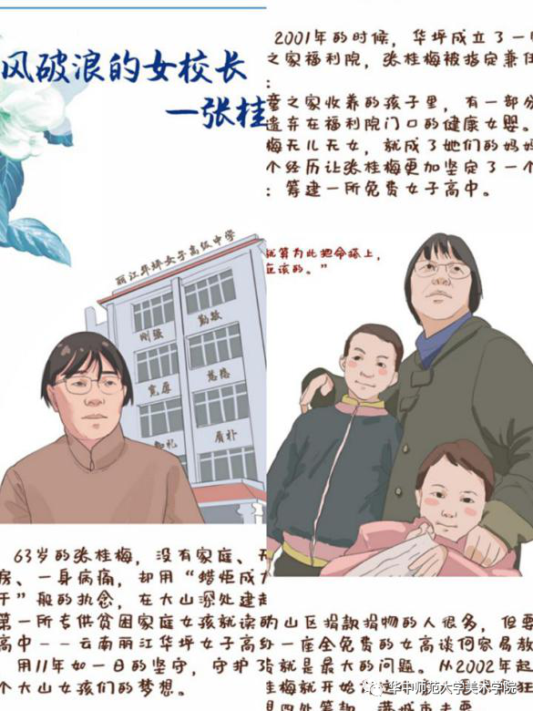 关于本章漫画的主题确定,经过了非常多的考量与讨论。首先,在第一期红色漫画——“舌尖上的长征”的基础上,队员们决定第二期漫画内容从人物入手,增强漫画的可读性,加深读者与人物的情感联系。在人物的选择方面,队员则认为对近期的网络关注度高的人物事迹进行叙述描绘,不仅有利于提高漫画的实时性与热点度,更可以使人物形象真实生动,也有利于人物事迹的传播与对其精神理解感悟。于是最终的人物确定,队员们选择了与近期高考联系紧密的热点人物——云南丽江华坪女子高级中学校长“张桂梅”。
