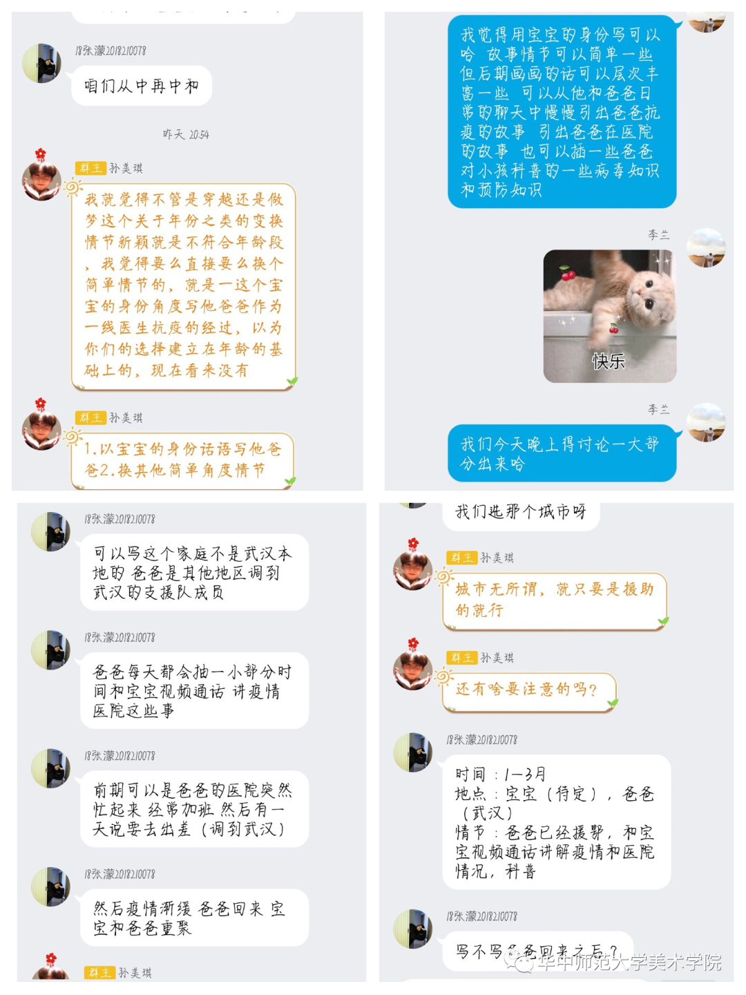 “童心战疫”社会实践队的各项任务还在持续积极的开展中,项目成员们都阐述了各自对绘本内容的想法,并且也在投票中选择出了最优方案。为了能够更好地完善整个绘本内容,增加内容的丰富程度和趣味性。在本周,“童心战疫”社会实践队的成员们也进行了大量的线上讨论。