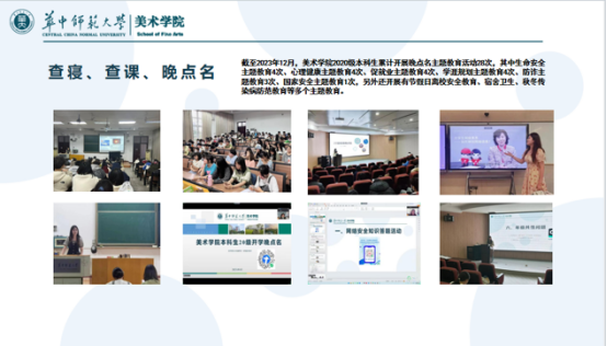 本年度学生工作紧紧围绕立德树人的根本任务,以安全稳定为基础,以学风建设为中心,以学生综合素质、教师教育技能、创新创业实践能力提升为重点,将能力培养贯穿人才培养的各个环节。截至2023年12月,累计开展年级晚点名主题教育活动28次;与年级学生深入开展1v1、1vN交流250余次(包括微信、QQ、宿舍走访、电话、短信等沟通形式),通过深入交流了解并解决学生急难愁盼80余次;通过走访寝室发现并解决学生问题 8 次;开展线上家访5次,赴成都市天府新区、武汉市东西湖区开展实地家访3次;与存在一定学业困难、家庭经济困难、就业发展困难的学生家长以短信、电话等方式沟通学生情况50余次……2023年20级年级工作平稳顺利开展,离不开一次次与学生们交心谈心了解问题、一通通与家长们焦急关切的通话、一次次寝室走访发现问题......