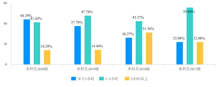从统计表中我们可以知道还是有许多同学每天在艺术学习上投入的时间过少,特别是20级与19级的同学究其原因,大一新生刚升入大学不久,他们放松的意识还保有惯性。无论是在学习还是在生活上还处于适应阶段,新鲜感强,会花较多的精力在社团活动、朋友聚会、兴趣爱好上,导致在专业学习上的投入时间较2017、2018级少。其次,大一学生对自己的学业规划还处于迷茫阶段,缺乏目标导向。随着对大学生活的适应和实习、找工作的种种压力和困难,对专业的重视程度提高,学习积极性随之提高。