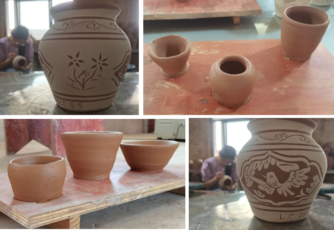下午,湖北省刻花工艺美术大师肖春娇来到活动现场指导同学们如何给风干的陶胚上釉、雕花。刻画技艺与水花技艺、贴花技艺、剪花技艺是湖北土陶的装饰技艺,同学们对此展现出了极大的兴趣。肖春姣老师刻花完全用腹稿直接作画,精美灵动的花鸟纹样随手拈来,逐渐布满陶胚的全身,同学们在感到惊奇的同时不由得对肖老师这些非遗传承人感到由衷的敬佩。长年累月的对技艺的磨炼消耗了太多的眼力,往往一个小的疏漏,就会导致一整件作品的的作废,因此刻花特别伤眼睛,肖春娇老师常年低头刻花,对颈椎和眼睛伤害很大,她刚刚做完眼睛小手术还在恢复阶段,听说华中师范大学学生来社会实践,依然坚持来现场教学还持续为同学们示范授课,指导学生实践并不停为同学们提出修改意见,并亲自上手修改。