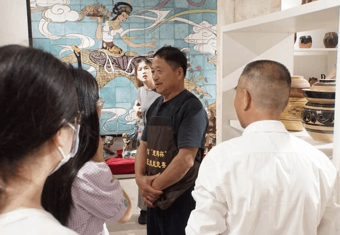 岚头矶工艺陶器厂厂长李普法、管窑老窑窑主李端斌、湖北省拉坯工艺美术大师肖启高对于老师同学们的到来表示了热烈的欢迎,并引导同学们参观了由气势恢宏的老陶瓷工艺厂厂房改造的陶器展览馆和书画展览馆。期间,李厂长和肖老师对于管窑的历史和独特的技艺以及制作手法进行了详细的讲解,尤其是对岚头矶工艺陶器厂曾经的辉煌历史进行了重点介绍。此外,各种精美的陶器引得同学们惊叹连连。