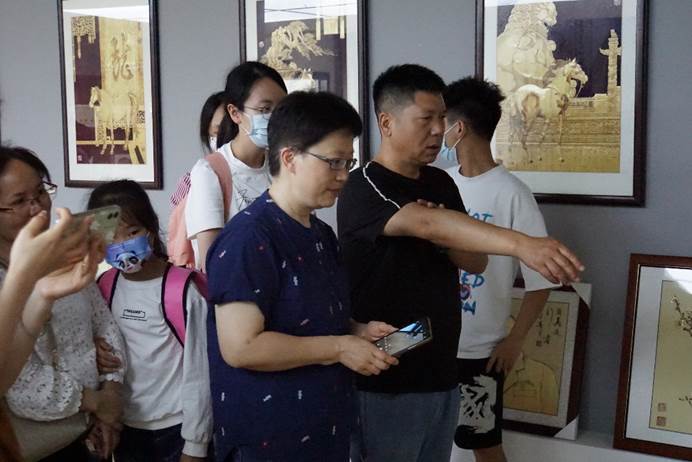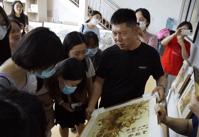 观学过后,邓友谱老师就邓氏麦秆画的起源和变化发展对同学们进行了细致的讲解。邓氏麦秆画脱胎于河南麦秆画,后因历史原因迁移到湖北省仙桃市,受仙桃市独特的人文气息和自然环境影响,又兼收并蓄湖北当地民间美术技艺特点,邓氏麦秆画逐渐形成了区别于一般麦秆画的精致的特点,从单纯的平面画作发展至半立体乃至全立体的工艺,并且沿用前辈制作工艺,使作品成为既美观又环保的绿色艺术品,传承至今已历八代。