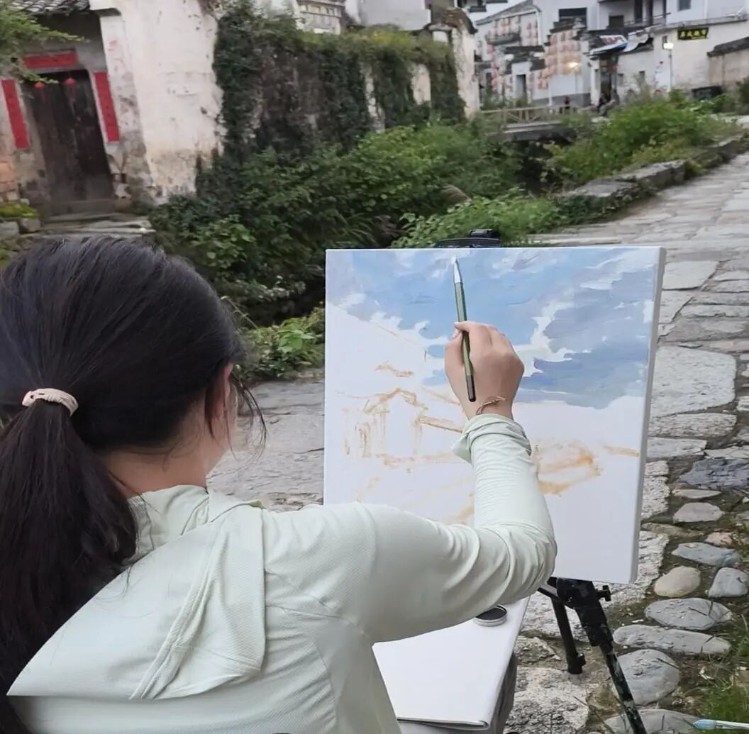 “老师说‘画好徽州,先要读懂徽州’,现在我终于明白,白墙黛瓦里藏着的是历史,是智慧,是一代代人的生活方式。当我在屏山画下一道墙缝时,会想起西递砖雕里的故事;当我调灰色颜料时,会想起宏村水面的光影——这些联系,让我的画有了不一样的重量。”