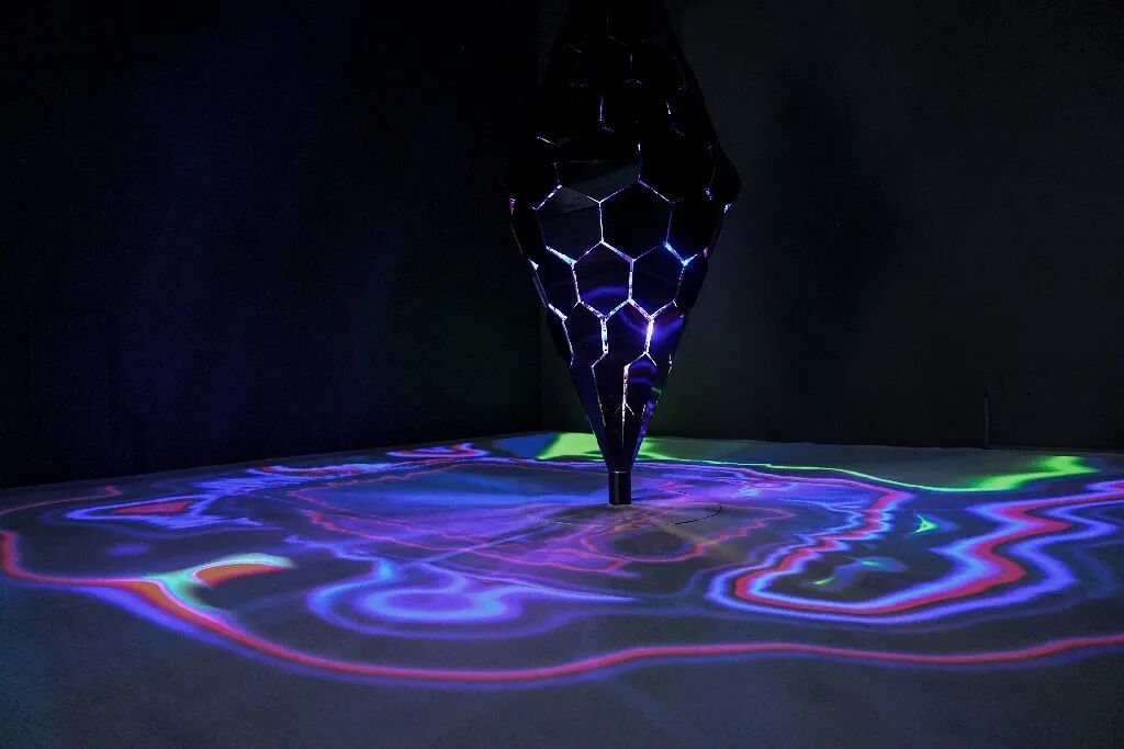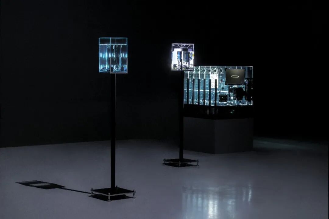 此时,“肉身机器”(AI BOX)被赋予“元艺术家”的身份,并作为运算中心,将元数据打包或分包,传输给“有机元Ⅰ”和“有机元Ⅳ”。随着数据的持续收集和进化,“有机元Ⅰ”通过透明界面将来自“肉身机器”的数据层漂浮于有机液体中,“有机元Ⅳ”则将数据转化为动态与漂浮的灯光变化。