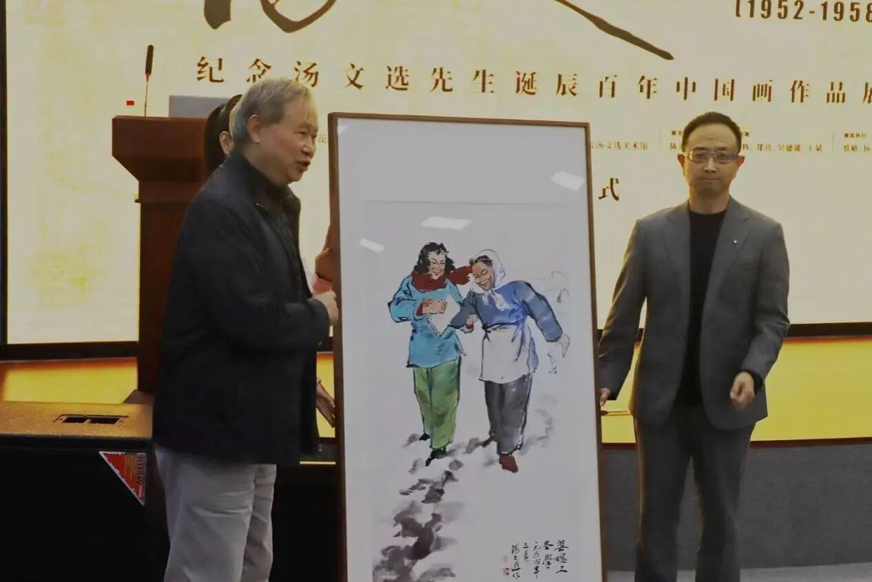 在随后举行的捐赠仪式中,汤立先生将《婆媳上冬学》高清复制作品赠予华中师范大学美术学院。该作品创作于1953年,曾获第二届全国美术作品展一等奖,并被中国美术馆收藏,其复制品亦曾作为国礼赠予苏联政府,具有重要的艺术与历史价值。美术学院院长郑达代表学院接受赠礼,并回赠汤文选先生在校任教期间的珍贵教师名册复印件,以文脉延续见证两代情谊。