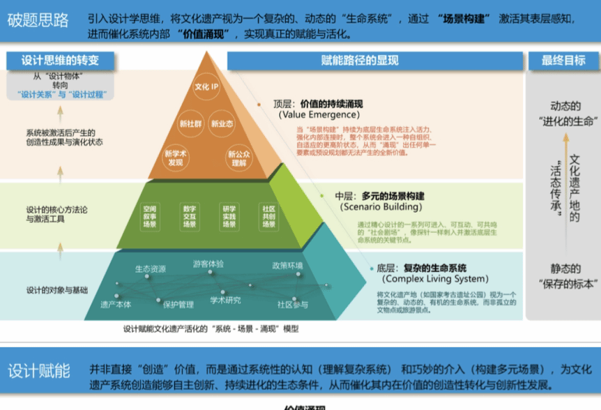 在报告中,严胜学老师聚焦国家文化公园建设背景下考古遗址公园普遍面临的“场景体验碎片化”“文化叙事扁平化”“价值转化同质化”等挑战,提出基于社会创新系统与数智设计,将文化遗产公园构建为一个复杂的、动态的“生命系统”,他详细阐释了“设计赋能文化遗产活化的‘系统-场景-涌现’模型”,强调通过系统服务设计与场景构建,为文化遗产系统创造出能够自主创新、持续进化的生态条件,从而催化其内在价值的创造性转化与创新性发展。