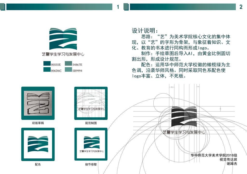 设计理念:“艺馨”学生学习发展中心logo以“艺”这一美术学院文化核心体现的字的字形为骨架,与象征着知识、文化、教育等文化内涵的书本元素进行同构构成了logo,充分展现出了中心“融美于教,融美于学,以美育人,以文化人”的工作定位。采用华师绿的同类色配色,赋予logo空间立体感的同时也为logo注入了华师的特色基因保证了学院辨识度的同时也保证了华中师范大学的辨识度。