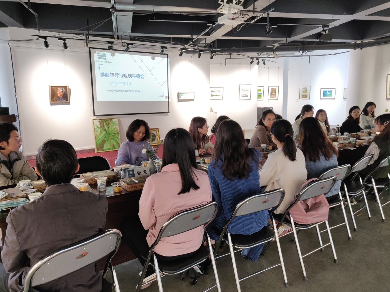 10月16日中午,美术学院艺馨学习发展中心促学活动之首期“学涯辅导”午餐会在十号楼八楼展厅顺利举办。美术学院副院长陈晓娟,视觉传达教研室严艳萍,美术教育教研室李舵,环境艺术教研室蒲阳,教学办主任黄慧芳,各年级辅导员,以及来自各个年级的15名同学参加了此次午餐会。