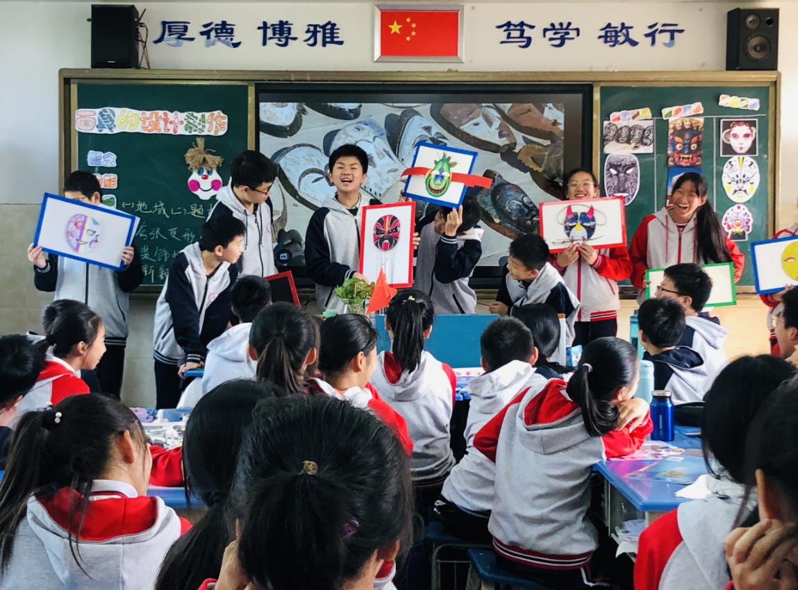 上图:华师一附中初中部七年级9班学生在美术实习生程老师授课中展示、自评面具作品