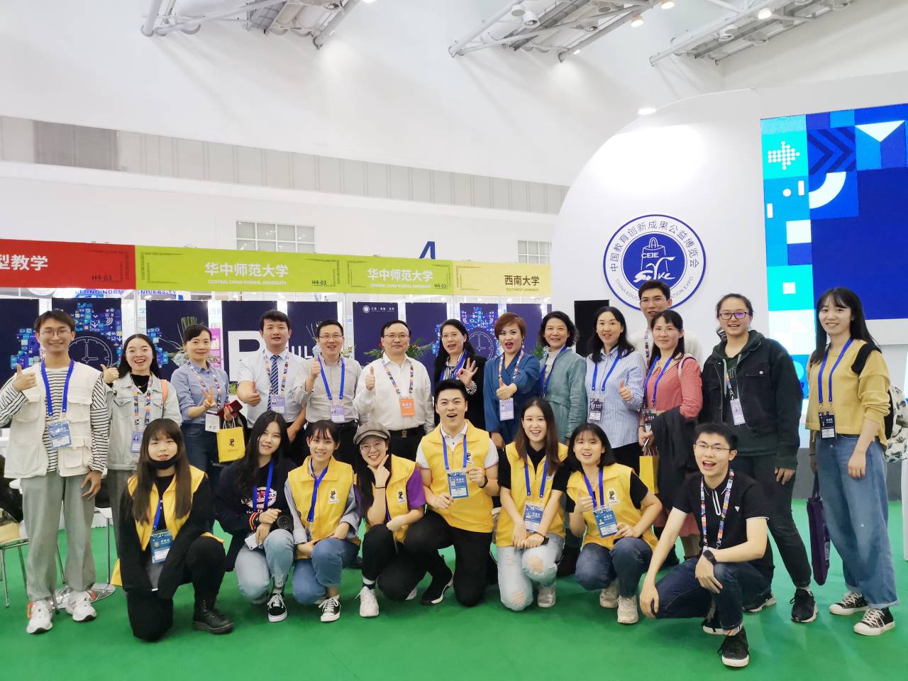 华中师范大学全体参展成员与到场领导在会场合影留念,大家喊出“我们来自华中师范大学”的响亮口号。