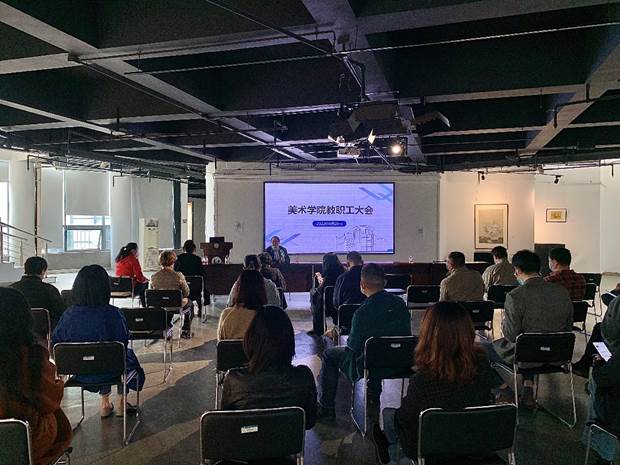 2022年4月29日上午,美术学院在十号楼八楼博雅美术馆召开了全院教职工大会,会议由学院党委书记付义朝主持,全体教职工参会。