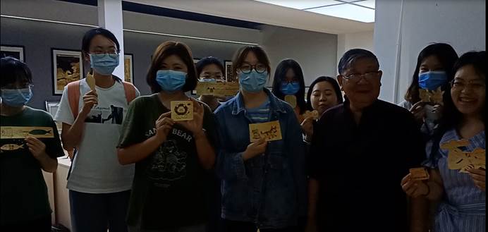 观学过后,邓友谱老师就邓氏麦秆画的起源和变化发展对同学们进行了细致的讲解。邓氏麦秆画脱胎于河南麦秆画,后因历史原因迁移到湖北省仙桃市,受仙桃市独特的人文气息和自然环境影响,又兼收并蓄湖北当地民间美术技艺特点,邓氏麦秆画逐渐形成了区别于一般麦秆画的精致的特点,从单纯的平面画作发展至半立体乃至全立体的工艺,并且沿用前辈制作工艺,使作品成为既美观又环保的绿色艺术品,传承至今已历八代。