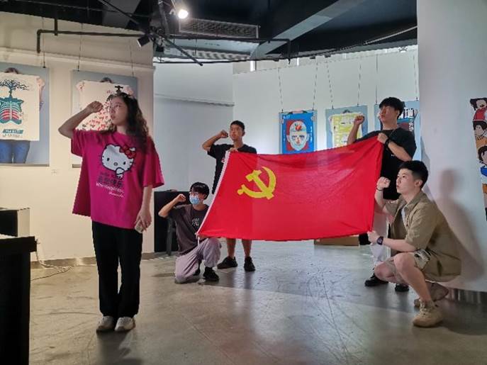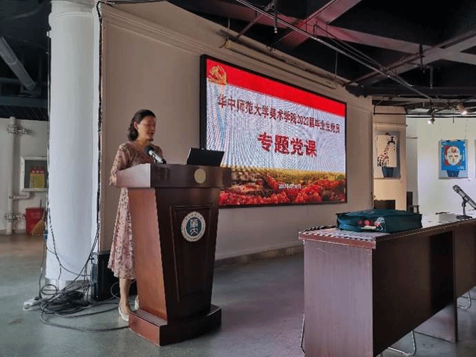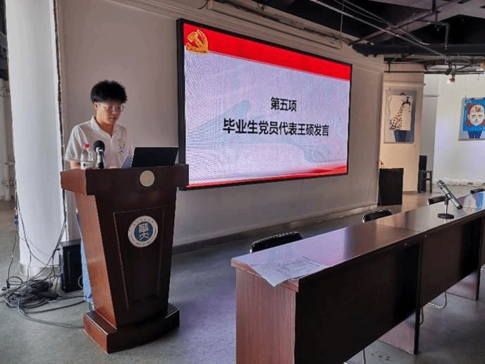 2022届毕业生党员代表王硕回忆了在美术学院的学习时光,对过往的党日实践活动做了回顾总结,并表示,毕业生们将坚定理想信念,矢志拼搏奋斗,牢记恩师教诲,永葆华师精神,在学思践悟中坚定理想信念,在奋发有为中践行初心使命,运用所学专业技能,努力回报学院、回报母校、回报社会。