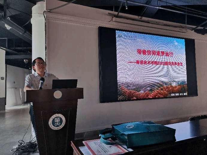 宣誓完毕后,美术学院党委书记付义朝为全体毕业生党员讲授《带着信仰逐梦远行》主题党课。付书记从自身经历出发,向毕业生党员们讲授新时代青年应该承担的责任与使命。在毕业生即将离开桂子山,走上新征途之际,付义朝书记特别强调了信仰的重要性,分别从信仰的内涵信仰的重要性中国共产党人的信仰党史人物的信仰与启示出发,为同学们上了一堂别开生面的思政课。付义朝指出,信仰是力量之源,信仰是行动之标,信仰是幸福之路,信仰是青年大学生大有所为最根本的精神力量。一个人有信仰就拥有了力量,一个集体有信仰就拥有了动力,一个民族有了信仰,这就是一个有希望的民族。在面对未来的不确定性时,很多同学会感到迷茫,他勉励同学们坚定信仰,保持对生活和事业的勤勉,争做中国美育事业的领跑者,不负青春年华,成就精彩人生。最后,付义朝希望即将离开校园,踏入社会的学子们“常怀赤子之心,将个人发展融于祖国发展之中;常怀感恩之心,保持昂扬向上的精神面貌,热爱生活,热爱从事的事业,在平凡岗位上干出不平凡的业绩;心系母校,心系学院的发展,有空常回家看看“。
