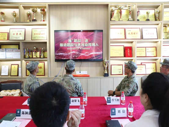 会议第二项,刘倩副书记就学院系列美育工作举措和成果向部队领导和同志进行了介绍,表示双方本学期的合作是学院美育思政工作领域的又一新探索和新成果,希望未来能在此基础上继续推进美育合作。陈颖嘉以“走近军营”“绘梦军营”“学在军营”三个篇章,对拥军共建主题文化墙绘和主题学习活动作了全面总结汇报。本次活动前后累积开展了五期,历时3个多月,共计200多名美院学子利用课余周末时间接力绘制了忠诚文化、战斗文化、安全文化和廉政文化四个主题文化墙,75幅作品,总面积近300个平方,充分展示了美院学子以艺术之笔深化美育服务,助力军队文化建设。陈颖嘉表示系列活动既增强了“艺心向党”学生党支部内部的凝聚力,同时有效扩大了支部的影响范围,带动和影响更多党支部和青年学子走进部队、了解部队、学习部队和宣传部队。
