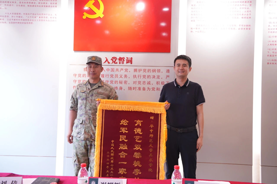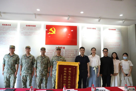 会议第三项,部队教导员赵贤飞致感谢辞,感谢美术学院的支持和同学们付出,表示本次活动和相关成果已经在部队内形成良好的示范和宣传效应,希望在未来能继续在主题学习、艺术实践、党纪教育和文化共建等领域加深合作。最后赵贤飞代表部队向学院赠送印有“绘军民融合一家亲,育德艺双馨桃李林”的锦旗,双方合影留念。