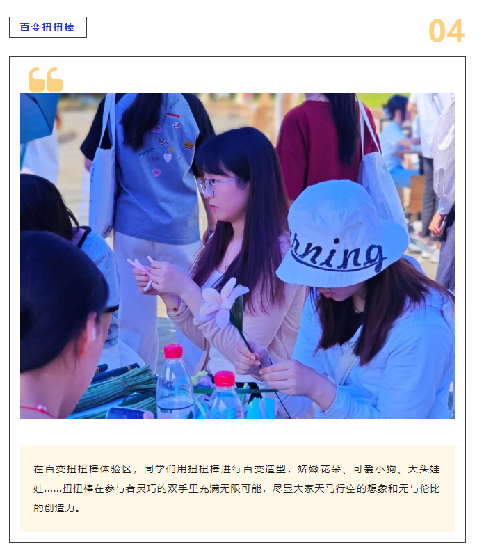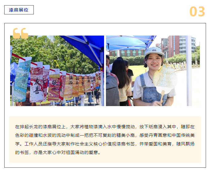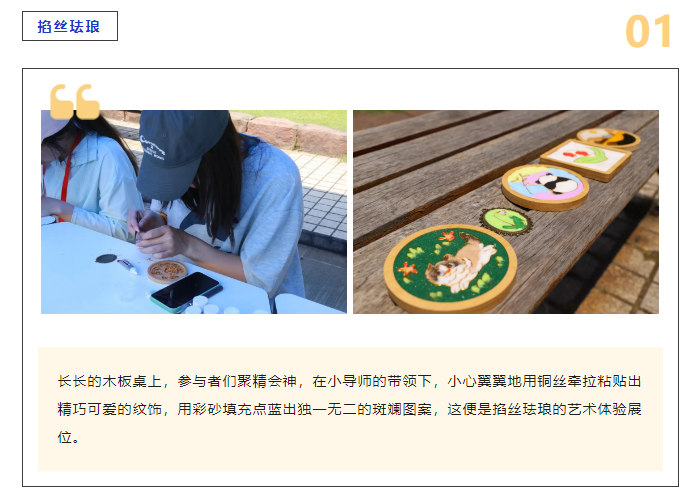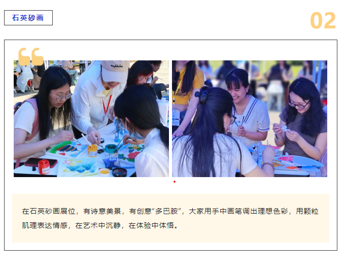 艺术体验区同学们参与热情高涨,该区域共有掐丝珐琅工艺制作、石英砂画、漆扇制作和百变扭扭棒四种艺术体验活动。活动开放期间,共有近400余名师生前来参观,并积极参与艺术体验活动。