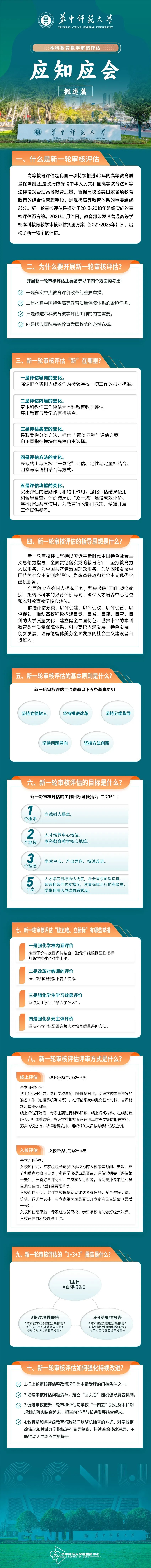 为迎接教育部新一轮本科教育教学审核评估,推动全校师生深入了解和熟悉审核评估知识,准确理解与掌握审核评估的规范要求,华大官微特推出“本科教育教学审核评估应知应会”系列介绍,今天推出第1期《本科教育教学审核评估应知应会(概述篇)》。