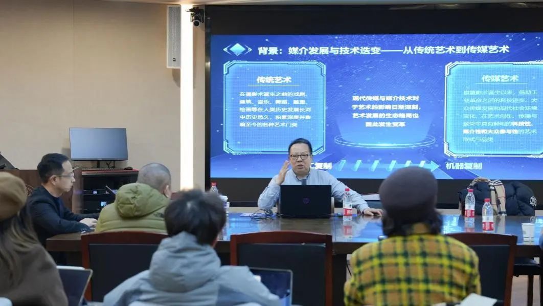 2024年12月25日,由华中师范大学美术学院主办的科研研习营系列学术讲座在美术学院五楼会议室举行。本次讲座由美术学院院长郑达教授主持,邀请到北京师范大学艺术与传媒学院教授、博士生导师,中国电视艺术家协会副主席,原北京电影学院原党委副书记、副校长,原北京师范大学艺术与传媒学院院长胡智锋教授以《传媒艺术发展新景观之观察和思考》为题,从媒介迭变和传媒艺术形成发展的背景切入,考察了传媒艺术发展的新特征,剖析了传媒艺术发展的新体验,提出了传媒艺术发展的新思考。