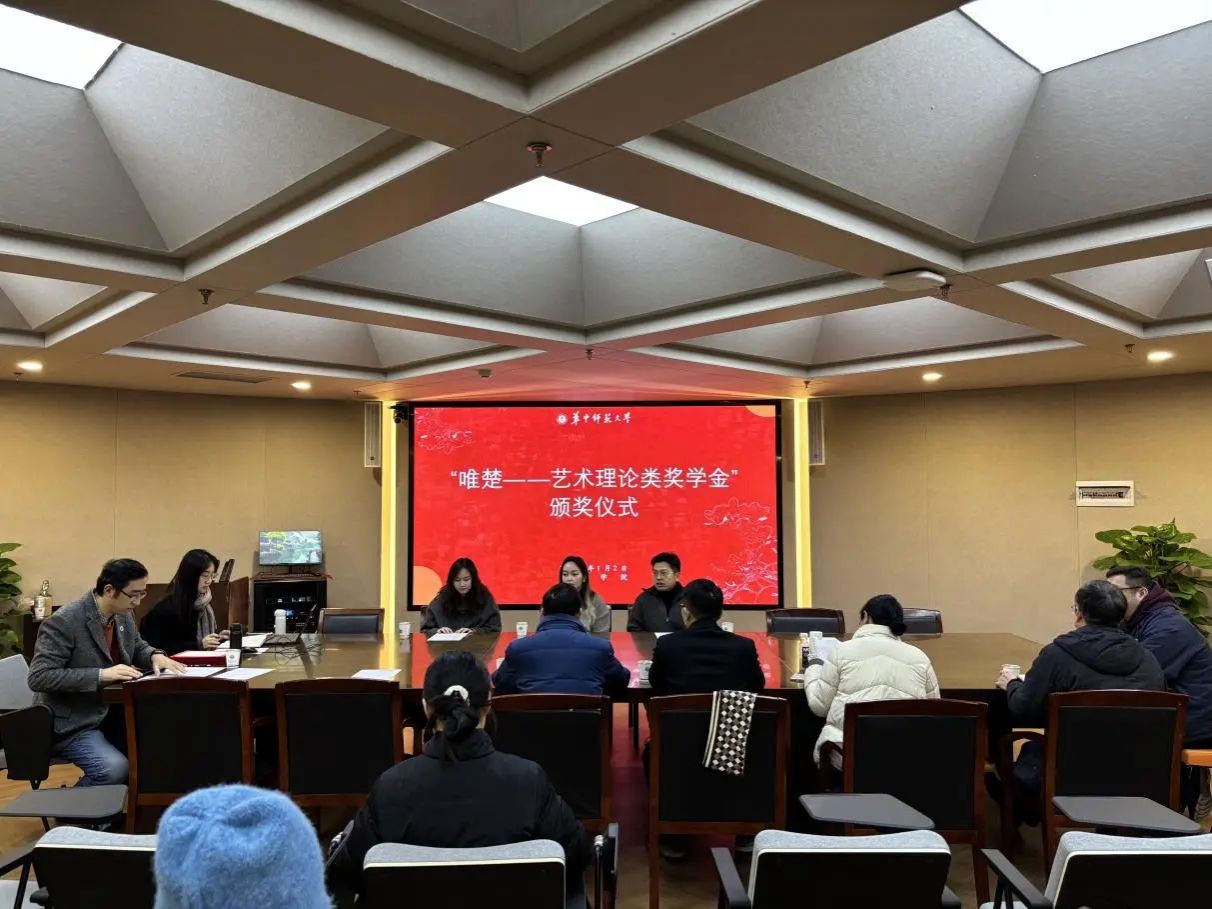 2025年1月3日上午,华中师范大学美术学院“唯楚——艺术理论类奖学金”颁奖仪式于五楼会议室举行。武汉戴思克教育咨询有限公司总经理杨丹妮、董事长陈姣、董事肖仕煜,华中师范大学美术学院副院长蔡敏、荆楚艺术研究中心主任陈晓娟教授、艺术史论教研室主任杨贤宗教授、艺术史论教研室喻颖副教授、肖笛副教授、余静贵副教授、科研办贾若楠老师以及学院相关学生参会,会议由蔡敏副院长主持。