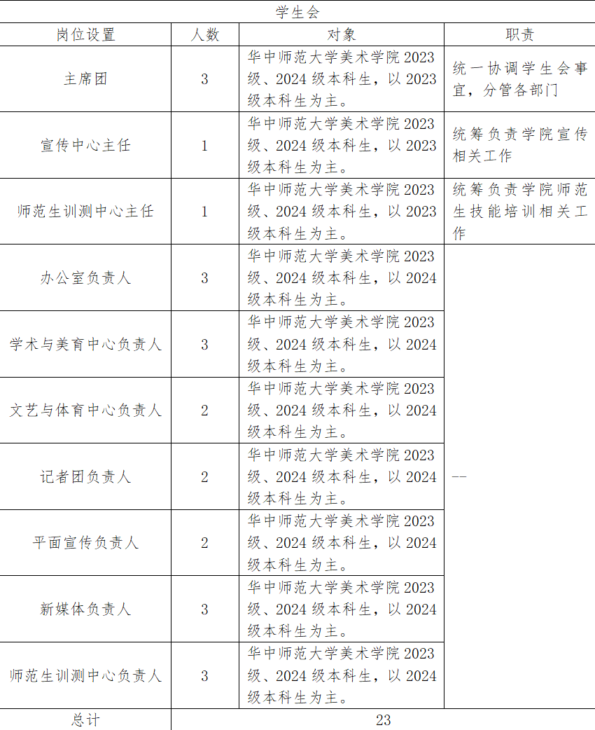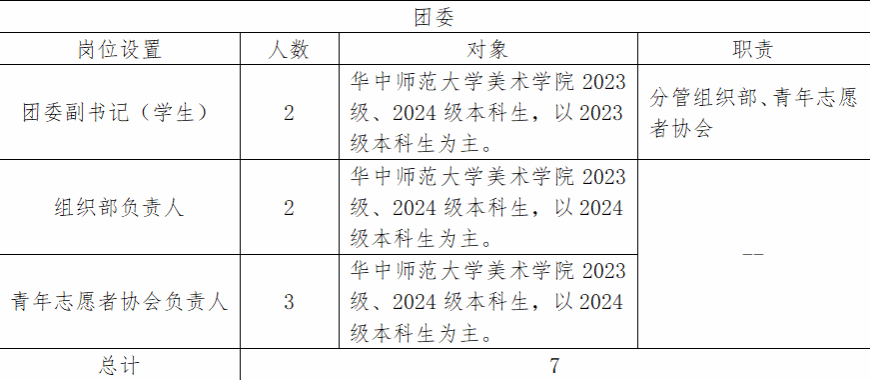 近年来,美术学院团委、学生会在校团委和院党委的领导下,紧紧围绕学校和学院工作,以务实的作风,创新的思维积极主动开展了一系列有特色、有针对、有成效的团学工作,取得了一定的成绩。为进一步加强学生干部队伍建设,落实团中央、团省委关于高校团委、学生会组织改革的有关要求,结合美术学院工作实际,本着“公平、公正、公开”的原则,选举美术学院2025-2026届团委、学生会干部。现将有关事项通知如下: