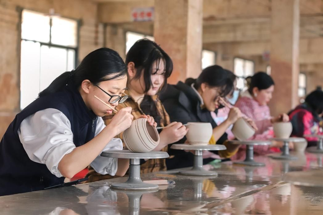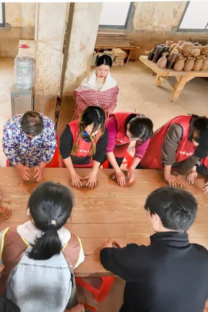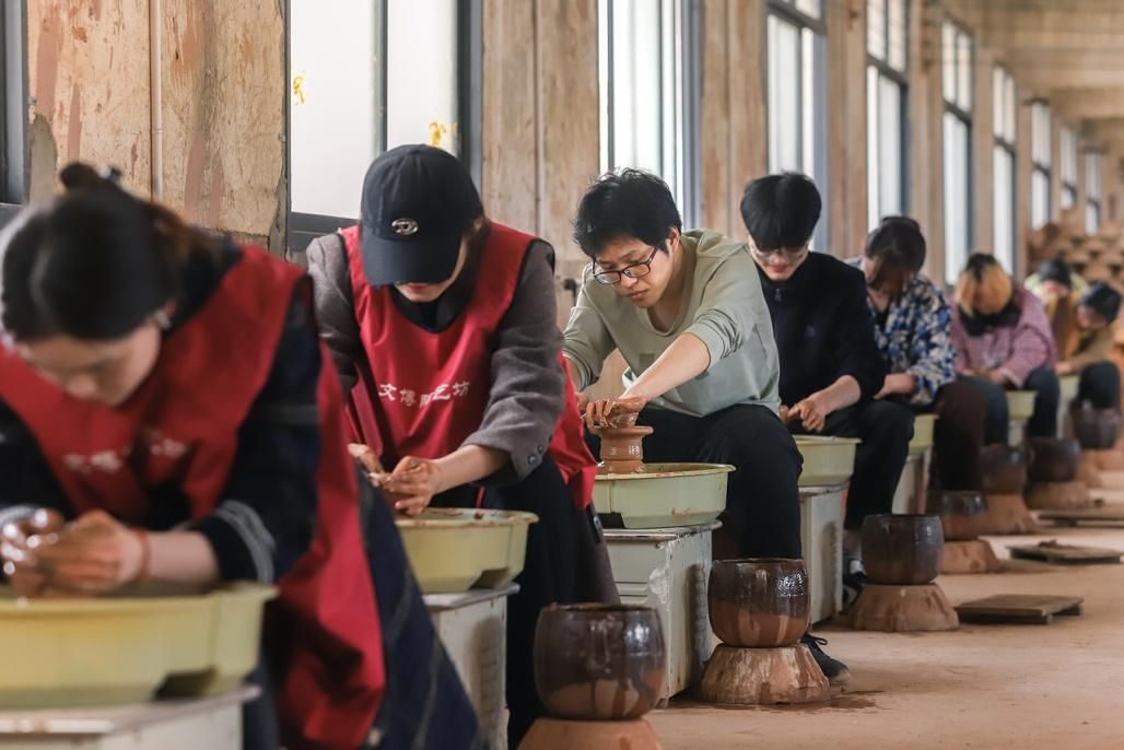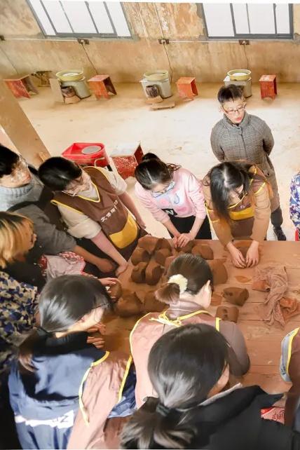 参观完千年龙窑后,就到了实践环节。同学们将制陶师傅们团团围住,听他们讲解拉坯和刻花要领,又不时搓搓手掌,跃跃欲试。