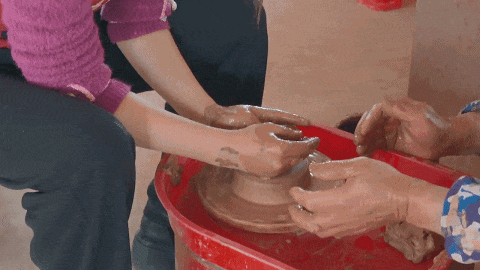 但对于新手来说,看似容易上手的陶艺做起来却是困难重重——揉土、塑形、排气,都是一样的步骤,陶土在师傅们手中显得格外“乖巧”,而轮到同学们操作时,连水与泥的配比也难以捉摸。