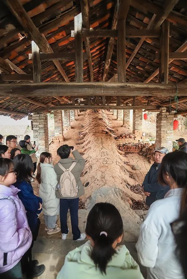 在参观李家窑千年龙窑时,新闻传播学院2021级马宇豪从龙窑底端窑口进入,用脚步丈量着千年龙窑的长度,用手指触摸着陶土的温度。当他穿过98米长的龙窑与顶端窑口处的同学汇合时,轻轻拈起一撮陶土,不禁感慨:“当火把冰凉的土变成了一个陶制品时,它就已经成为了一个文化的符号。”