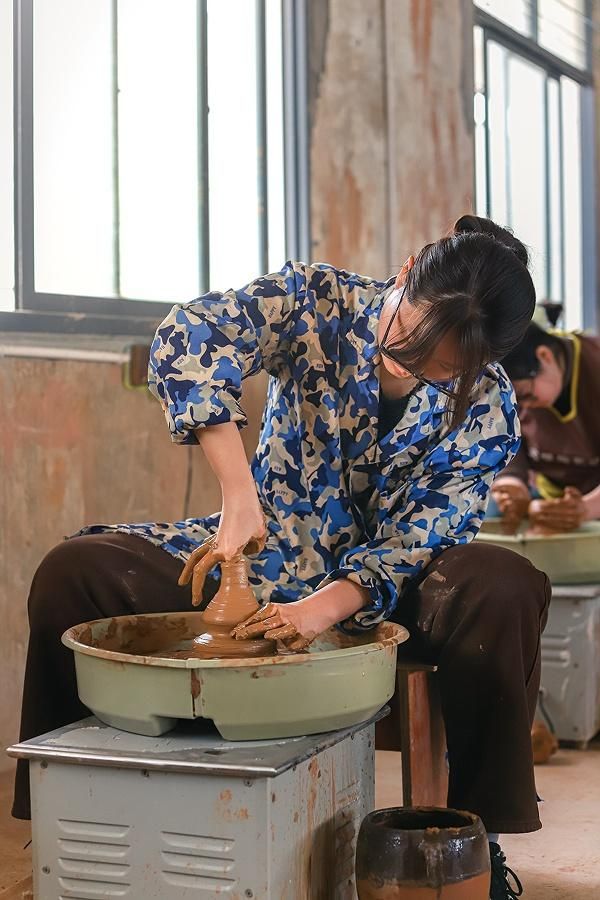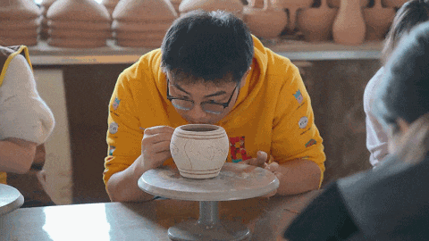 化学学院2021级袁萍刚开始想做一个茶杯,尝试了很多次都没有成功,“我脑子里只是想着“做茶杯”这一件事,却忽略了泥量、泥型,以及塑宽了如何去收口这些问题。”袁萍开始转变思路,学着师傅的手法,用手指后端稳稳发力。正如师傅所说:“你越想做什么的时候,反而越难,慢一点,会成功的。”