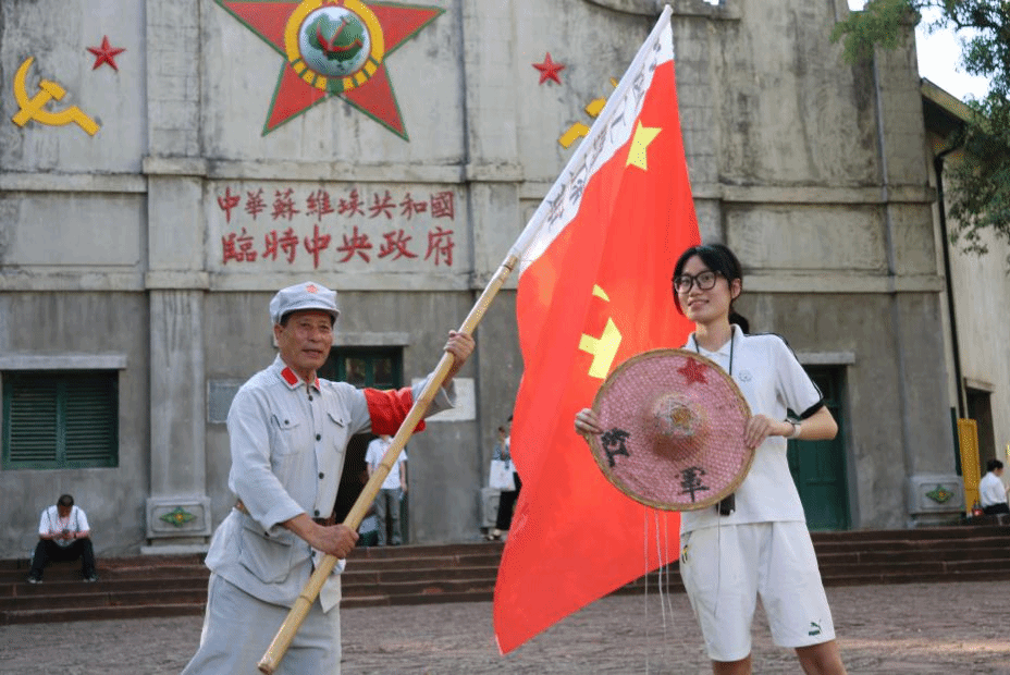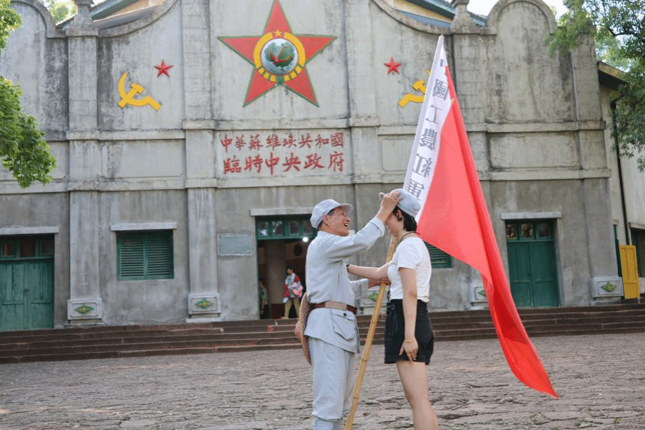 随后,团队驱车前往二苏大景区。在中华苏维埃共和国临时政府旧址前,成员与身着革命时期服饰、手持红旗的红色文化宣传员亲切互动,并集体合影留念。场景化的沉浸式体验,团队成员对革命历史的认知与感悟愈发深刻。