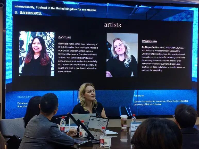 随后,Smith教授延伸介绍了作品的跨学科创作思路,并分享了她在UBC的跨学科艺术工作室 Critical Future Studio/Lab(关键未来工作室/实验室)的教学理念。该工作室以沉浸式空间为核心,开展围绕气候变化、太空探索等议题的创作与研究,例如基于加拿大政府公开数据开发的Walking in the Cold《行走在寒冷中》,通过人工智能模拟冻土融化对海平面的影响。