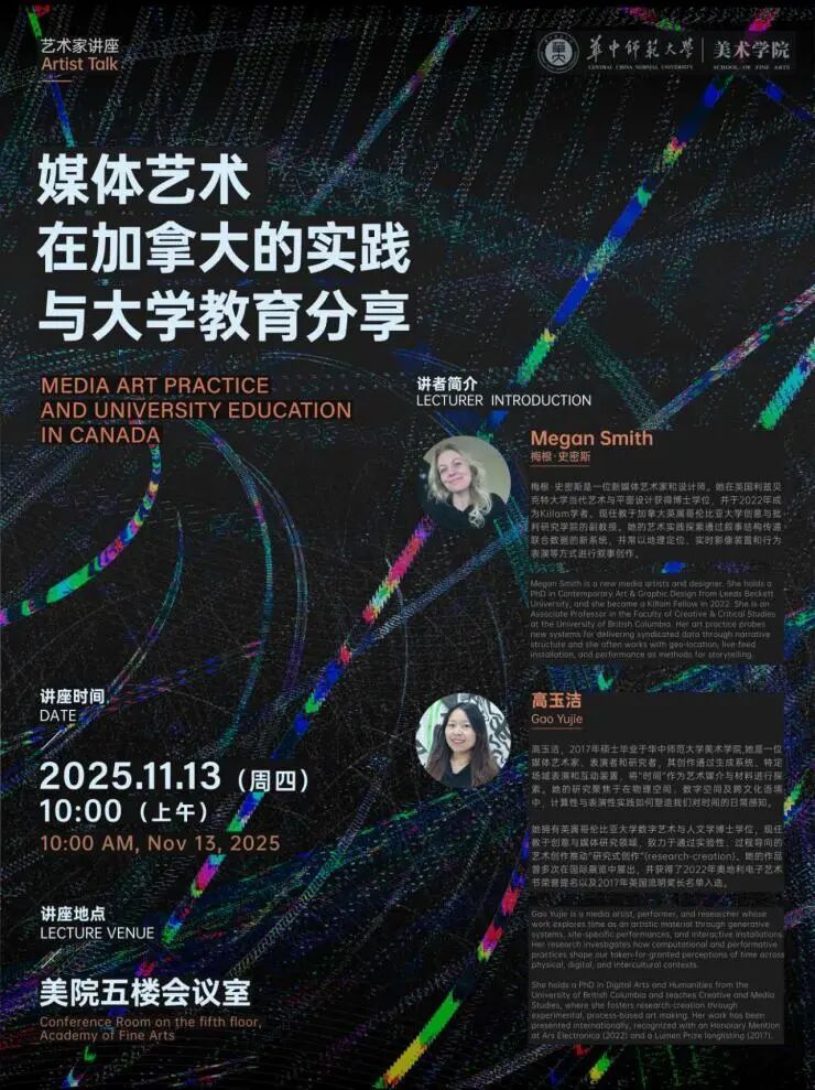 2025年11月13日上午,由华中师范大学美术学院主办的学术讲座《媒体艺术在加拿大的实践与大学教育分享》在学院五楼会议室顺利举行。讲座由美术学院院长郑达主持,加拿大英属哥伦比亚大学(UBC)创意与批判研究学院副教授Megan Smith与讲师高玉洁受邀主讲,吸引学院众多师生参与。