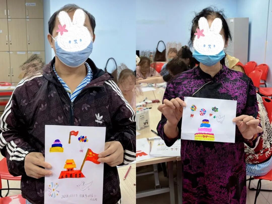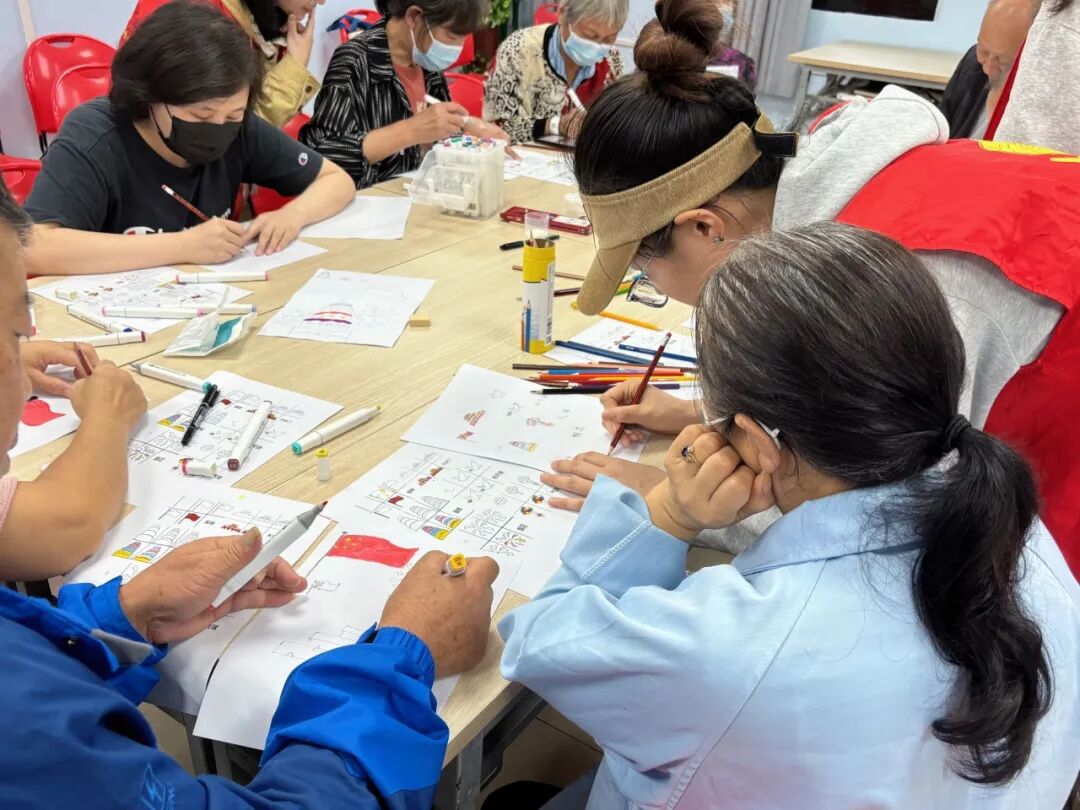 现场,六张方桌拼成大创作台,患者围坐四周。桌上备有印着天安门、国旗等国庆元素线稿的画纸,及操作简便的马克笔、彩铅,充分兼顾患者实际操作能力。
