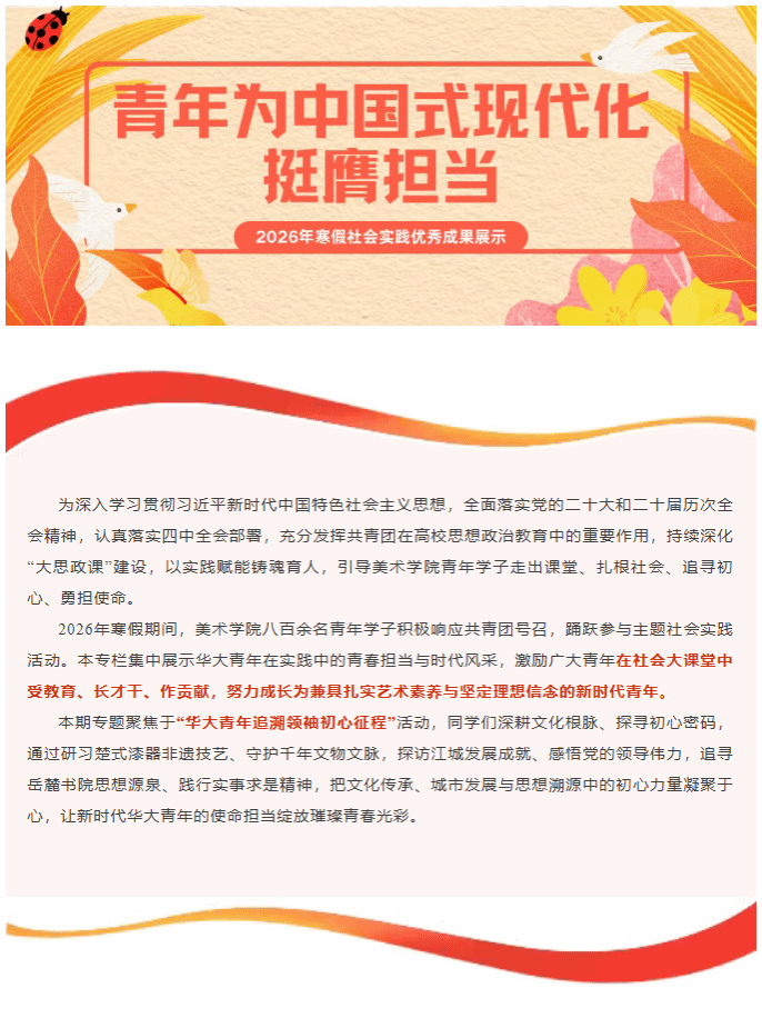 这个寒假,美术学院学子以实践追寻初心,用脚步丈量征程。从楚式漆器的匠心传承,到岳麓书院的真理探寻,再到江城蝶变的时代见证,华大青年在"大思政课"中锤炼本领、坚定信念。初心如炬,使命在肩,新时代青年正以青春之力,书写文化传承与民族复兴的时代答卷。