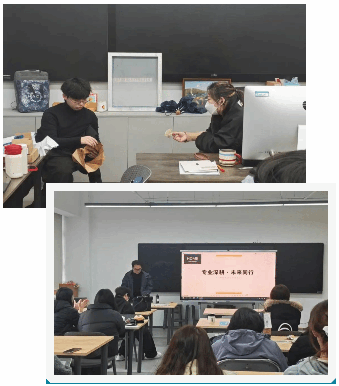 陈颖嘉老师为大家详细梳理了往届学长学姐的毕业去向与发展路径,从考研深造、留学申请到企业就业、自主创业等多个维度,用真实案例为同学们呈现了视觉传达设计专业的多元发展可能。专业课艾欢老师与同学们展开了一对一的深度交流。艾欢老师结合每位同学的作品风格、学习状态与兴趣方向,针对性地给出专业发展建议:针对想深耕平面设计的同学,建议加强版式设计与品牌视觉系统的练习;对数字媒体方向感兴趣的同学,鼓励尝试动态视觉、交互设计等新兴领域;计划考研的同学,老师也细致梳理了目标院校的备考重点与时间规划。