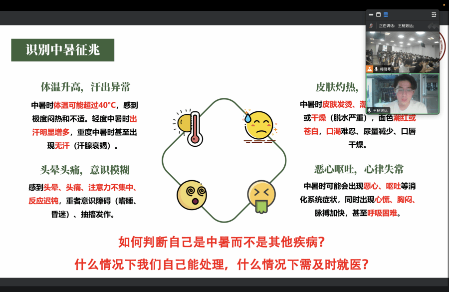 在讲解中暑的发病诱因时,王杨致远指出,高温环境、长时间户外活动、体力消耗等诸多因素都可能成为中暑的诱因。他强调,保持规律作息、合理饮食、适度补水以及良好的防暑措施对于预防中暑至关重要。此外,他详细介绍了如何通过科学方法有效预防和应对中暑,同学们可以通过携带防暑药品、定时休息补水、穿着透气服装等日常防护措施,来有效预防中暑。